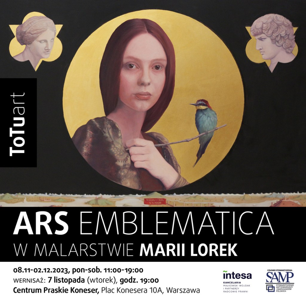 Wystawa „Ars Emblematica w malarstwie Marii Lorek” w Galerii i Domu Aukcyjnym ToTuart w Warszawie (Centrum Praskie Koneser, Plac Konesera 10A) będzie prezentowana od 8 listopada do 2 grudnia 2023, od poniedziałku do soboty w godzinach 11:00-19:00. Wernisaż wystawy odbędzie się we wtorek, 7 listopada o godz. 19:00.